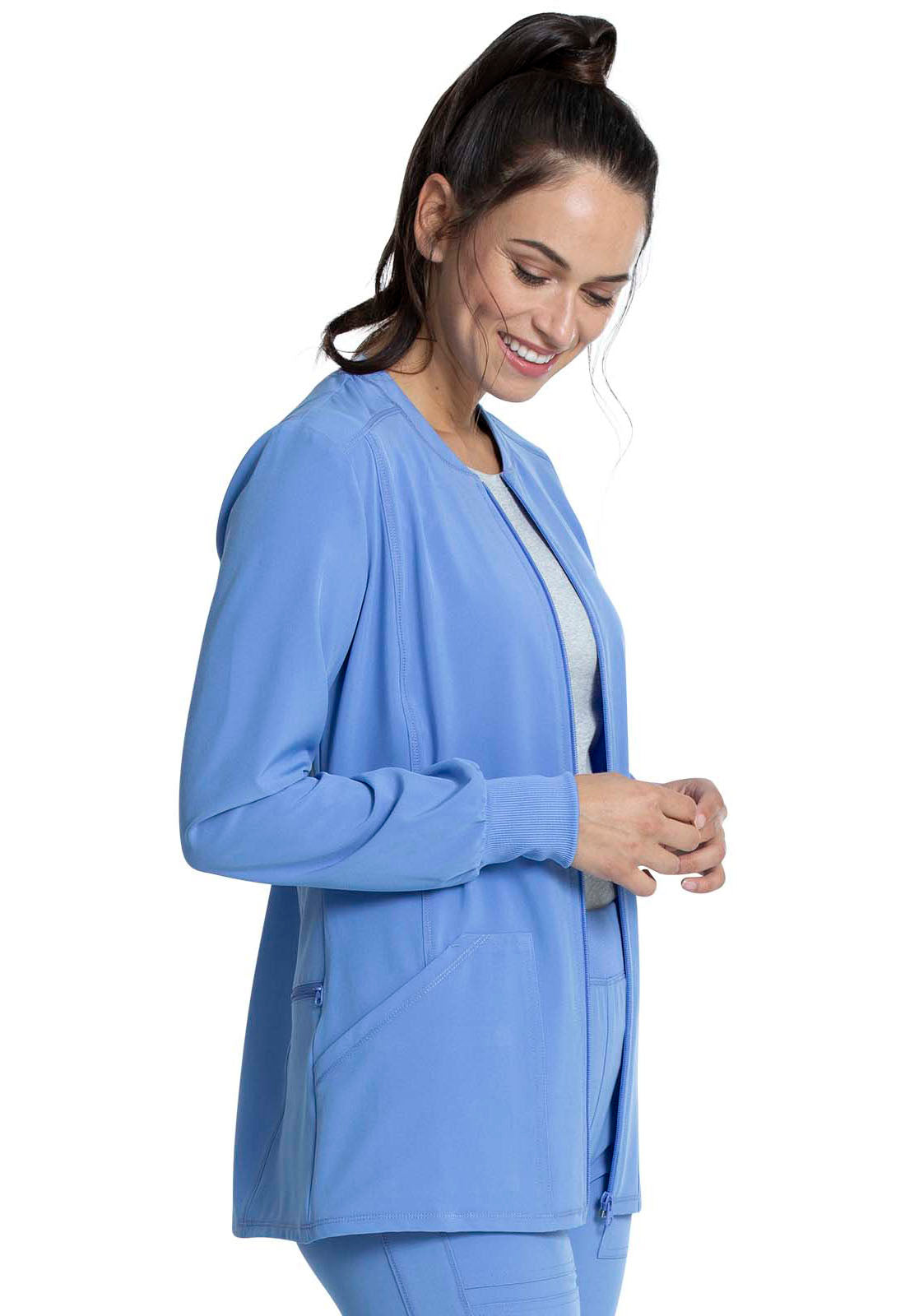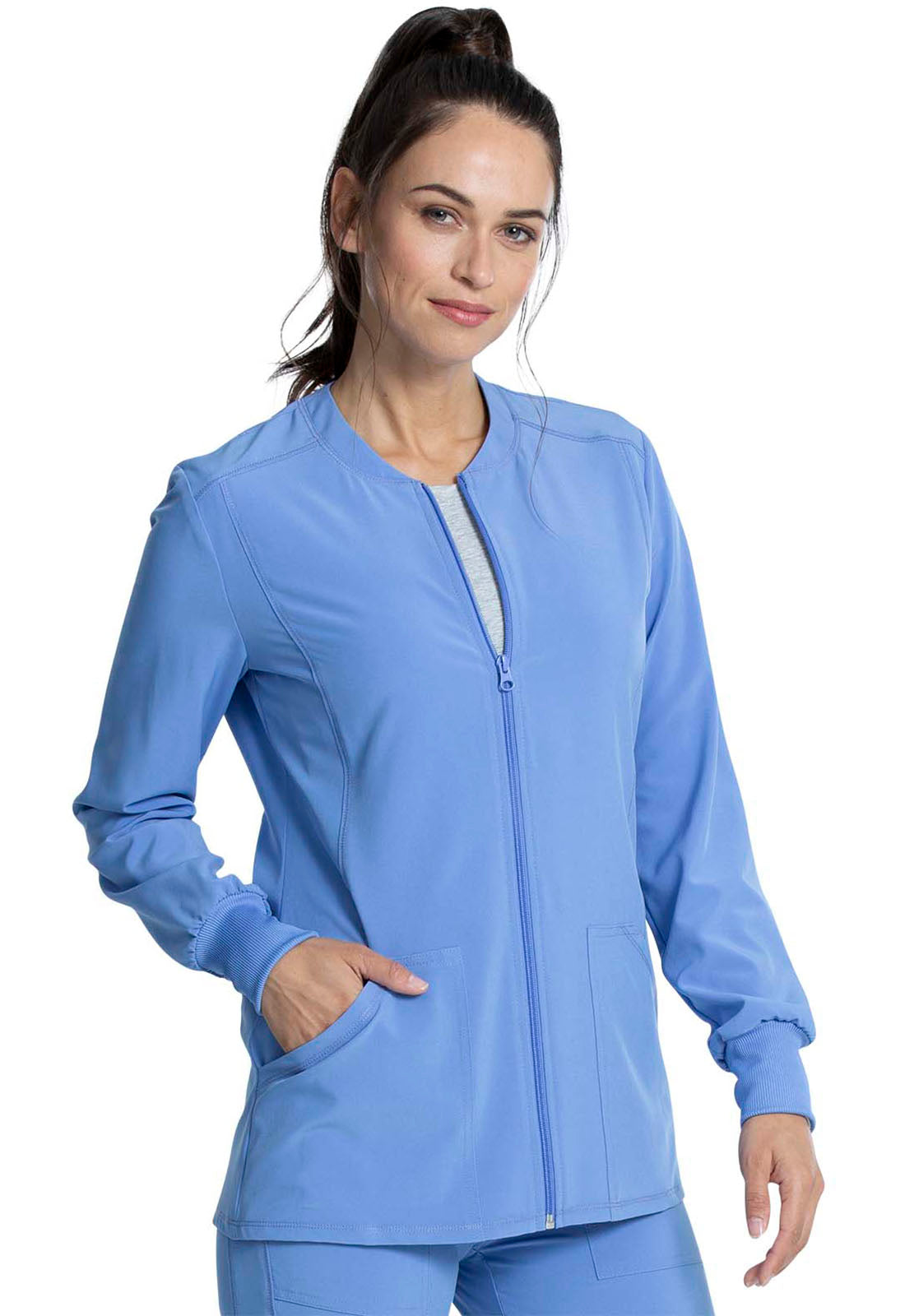 This round neck zip front jacket features front shoulder yoke seams in additions to front and back princess seams. There are four pockets and Rib-knit cuffs complete the look.